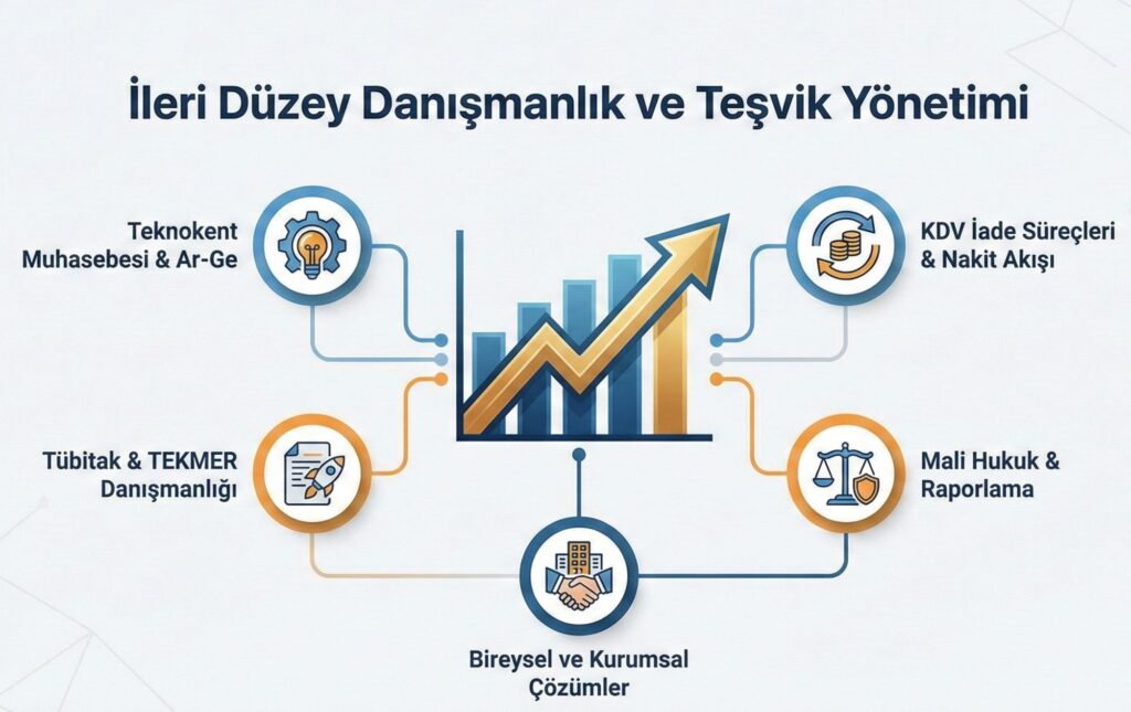 Teknokent firmalarına özel mali çözümler, Ar-Ge indirimleri ve Tübitak proje süreçlerinde uzmanlaşmış kadromuzla yanınızdayız. Devlet teşviklerinden maksimum düzeyde yararlanmanızı sağlıyor, nakit akışınızı güçlendirecek KDV İade süreçlerini hızlı ve hatasız bir şekilde sonuçlandırıyoruz.